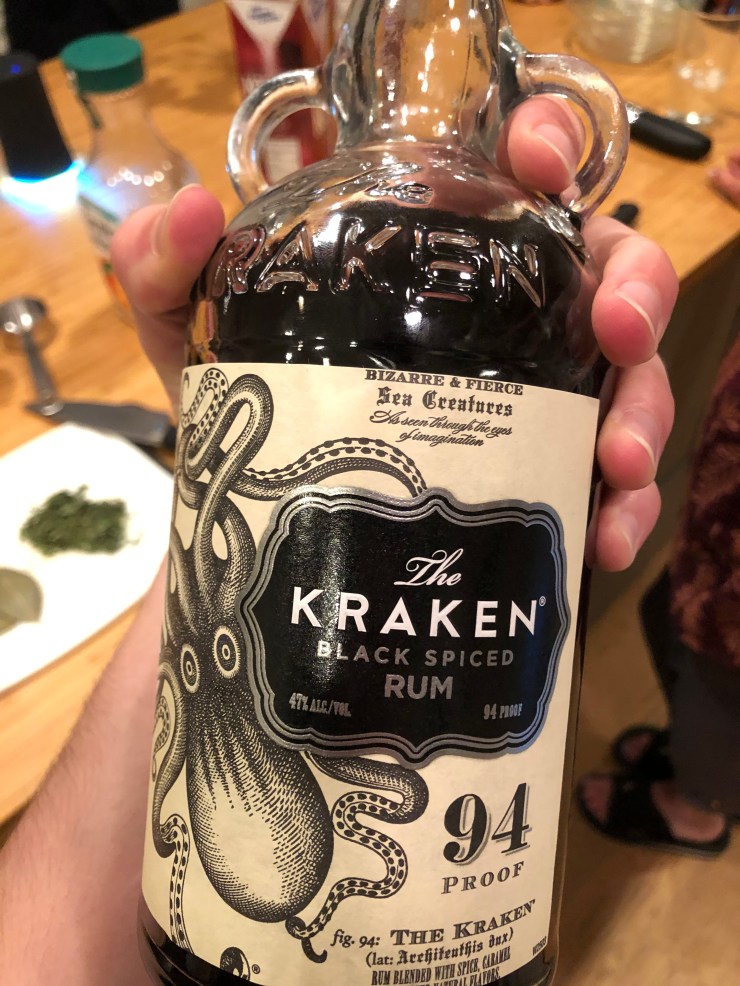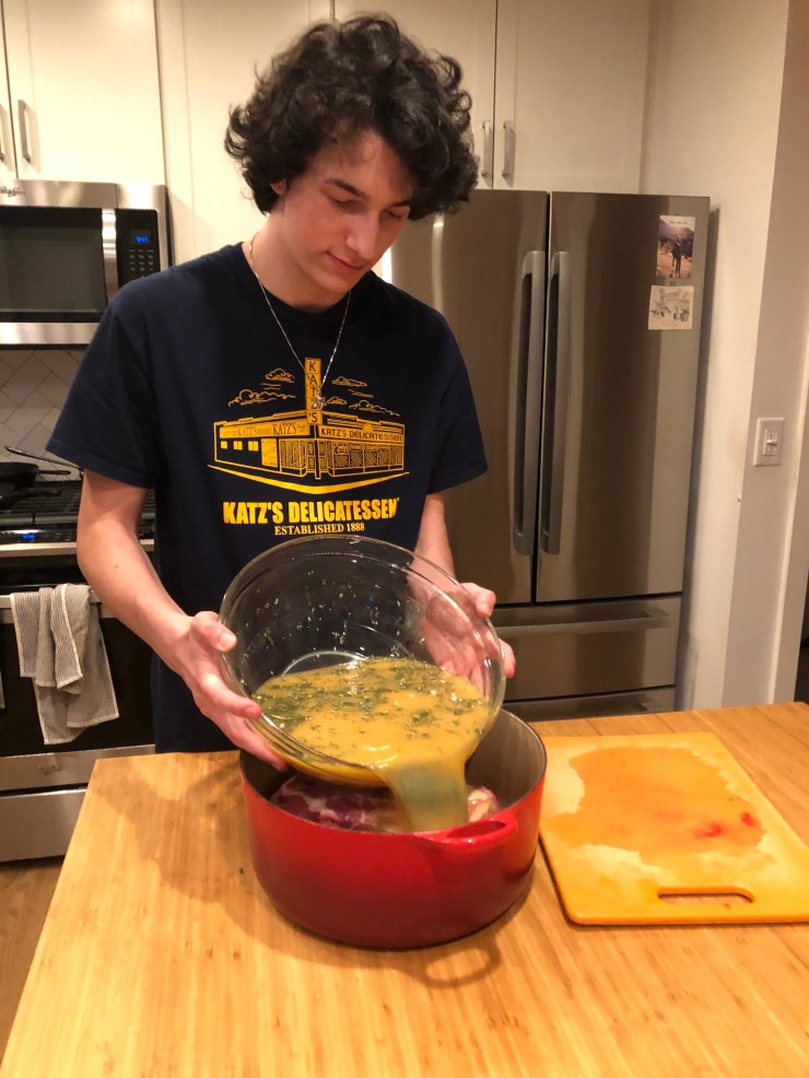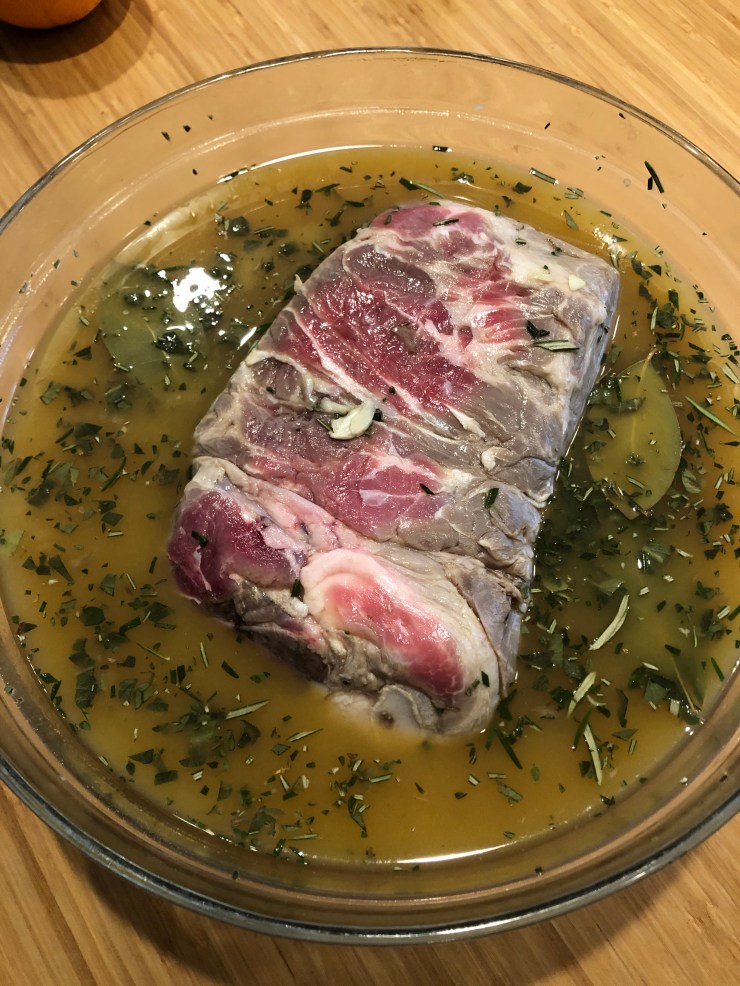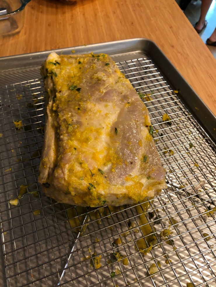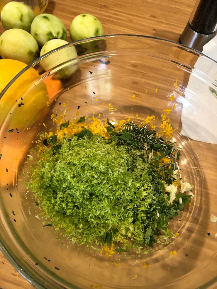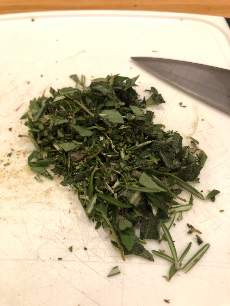 We have to chop our herbs, and peel and chop the entire head of garlic, but aside from that everything just goes into a bowl, gets mixed, and poured over our pork shoulder.