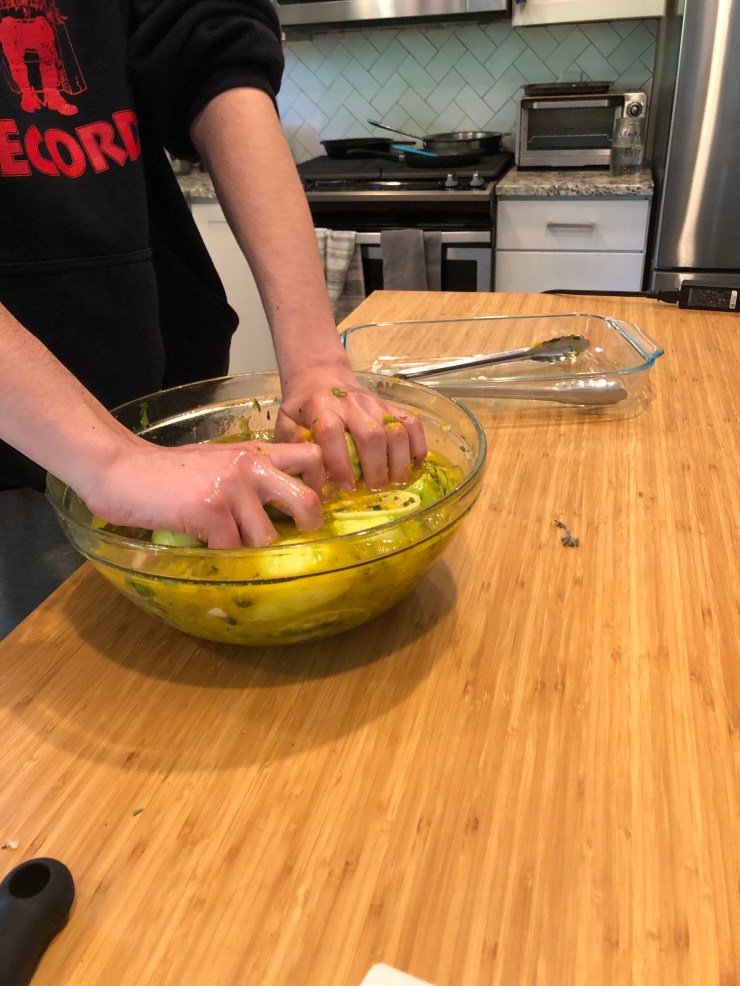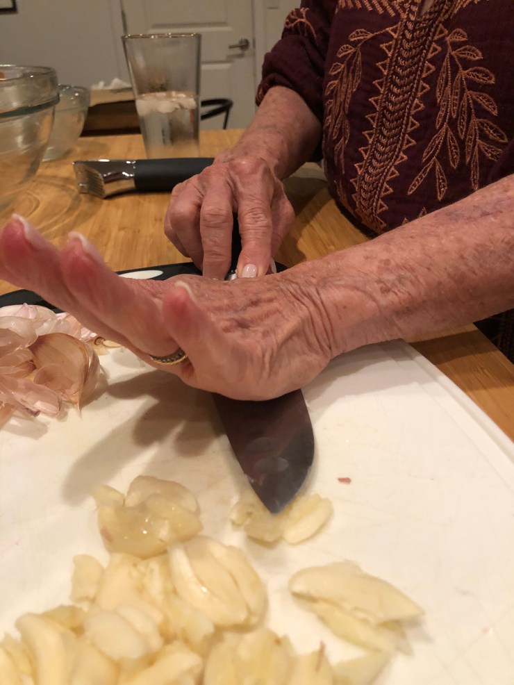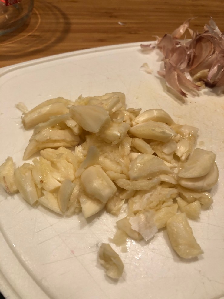 Now strap in because not only do we have to peel and crush the entire head of garlic (thanks again, Nana) but I have to zest and juice all 9 of our citrus units.