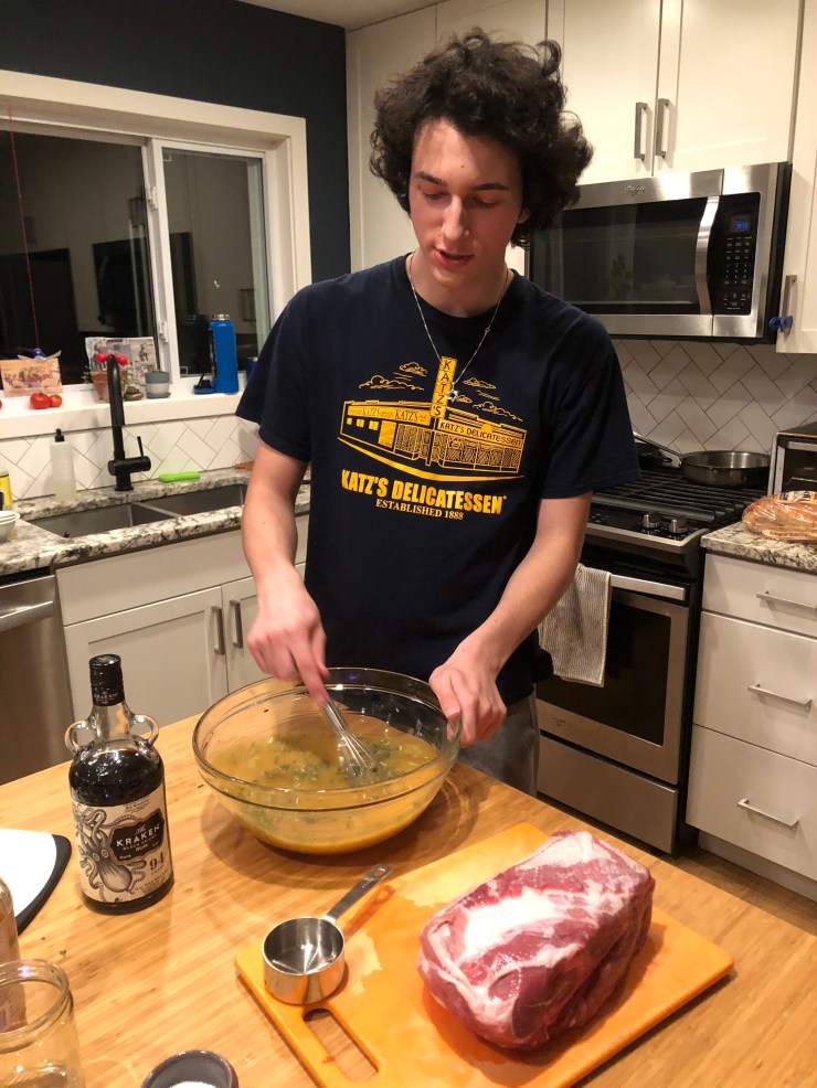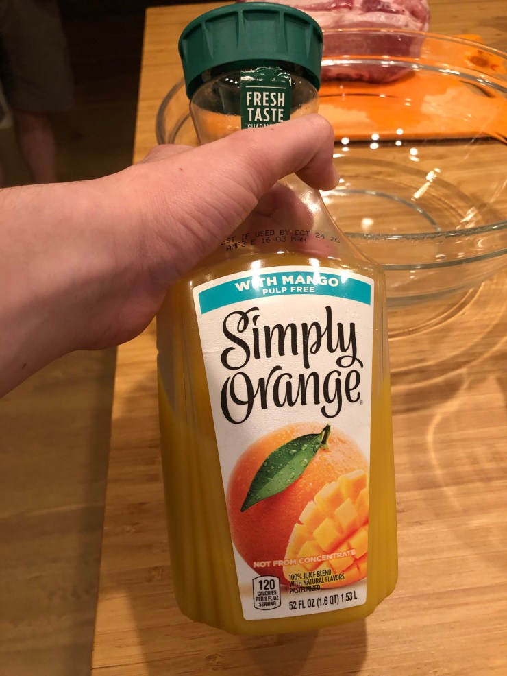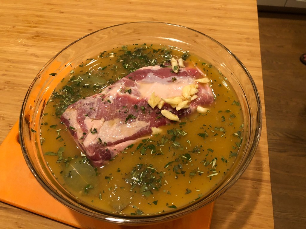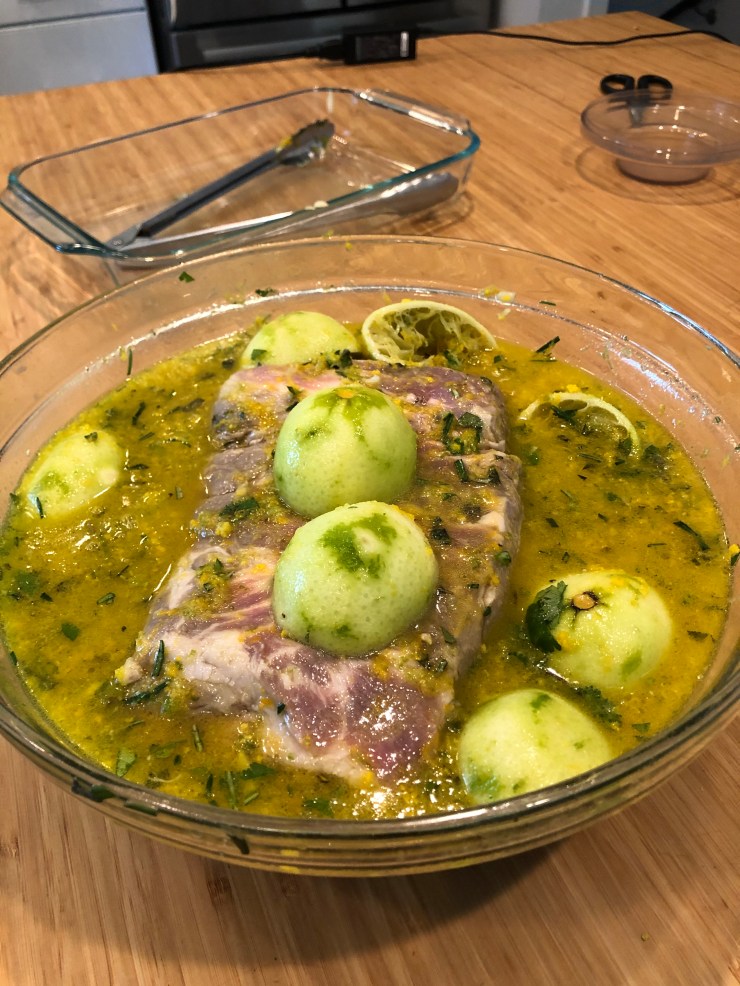 Our pork sits in our marinade for a few hours in the fridge, and then, at long last, we are ready to finally cook it.