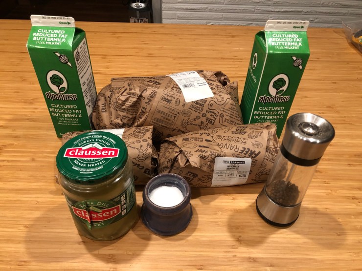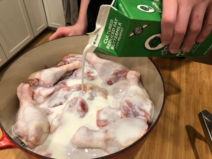 We’re gonna keep it simple – something like a Nashville Hot Chicken would clash with our cranberry sauce and potatoes. As such, we’re starting with a classic overnight buttermilk brine.