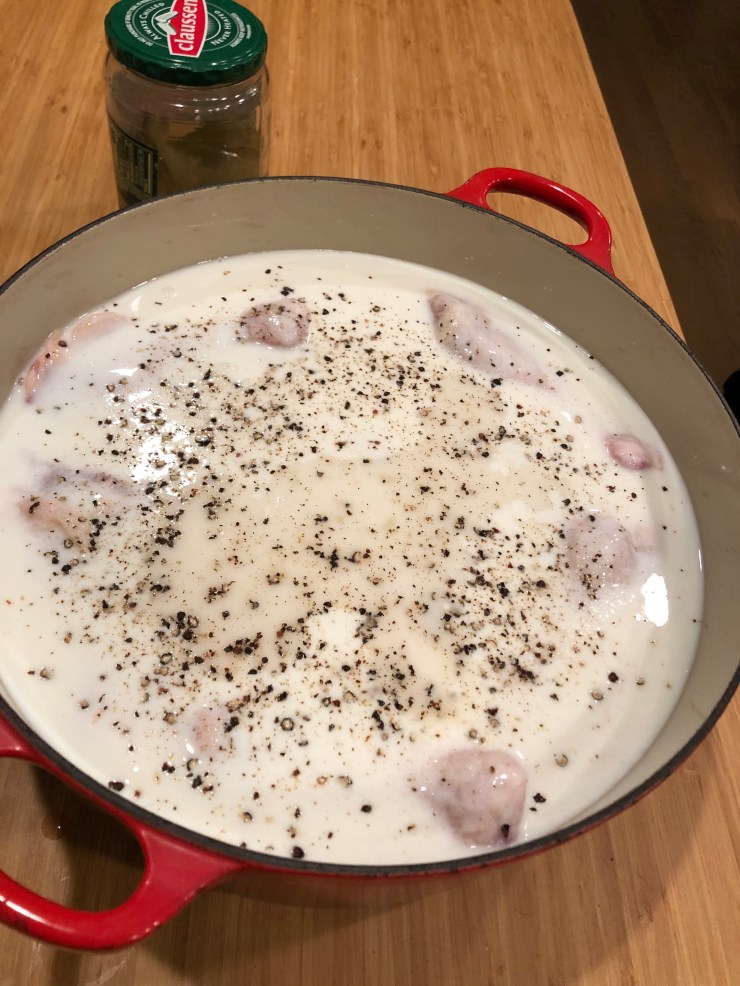 We need our largest Le Creuset to fit all of this chicken on Thanksgiving Eve.