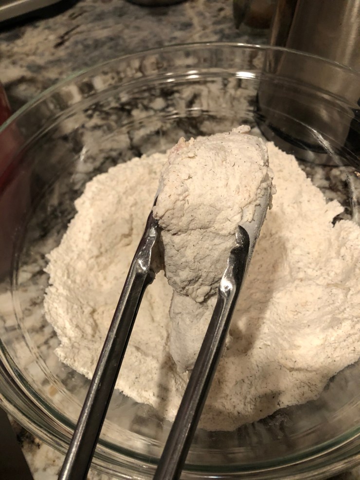 …we ran into problems pretty quickly. When Doug and I were initially purchasing the chicken, we agonized over whether or not we should get chicken breasts because we were concerned that they were too big (be mature) to fry effectively. And it turns out, our concerns were legitimate. The cold chicken breast coming out of the buttermilk caused the temperature of our oil to dip, which produced un-crisp chicken and longer cooking times.