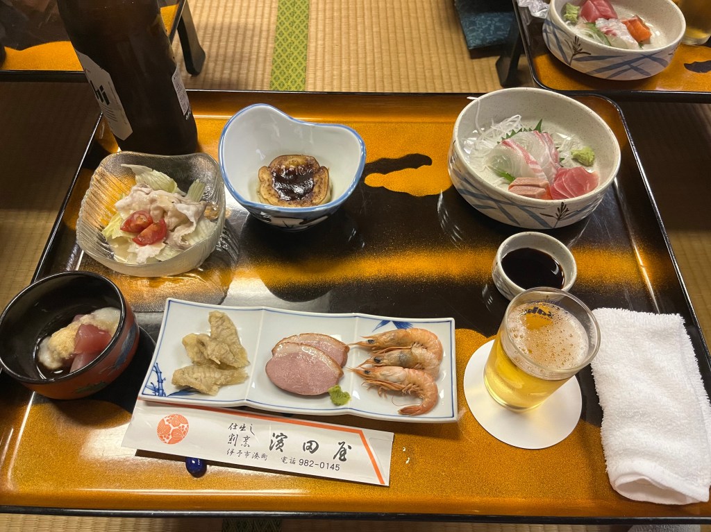 I would have left right after school ended on Friday, but that evening I had an enkai (drinking party) with the Iyo Board of Education. It was held in the upstairs room of a traditional restaurant in Iyo. There were maybe 20 people total, including my fellow Iyo ALTs. Given that it was thrown in honor of the new arrivals (me and Jazmyne), we got to sit at the table with the bosses. And by sit, I mean on the tatami floor, cross-legged. Not an easy feat for someone on the taller side with limited lower-body flexibility. We had a set meal with some sashimi (including the local specialty of tai, or sea bream), eggplant with tare (a sweet, thick soy sauce, a salad with meat, some duck slices, and shrimp.