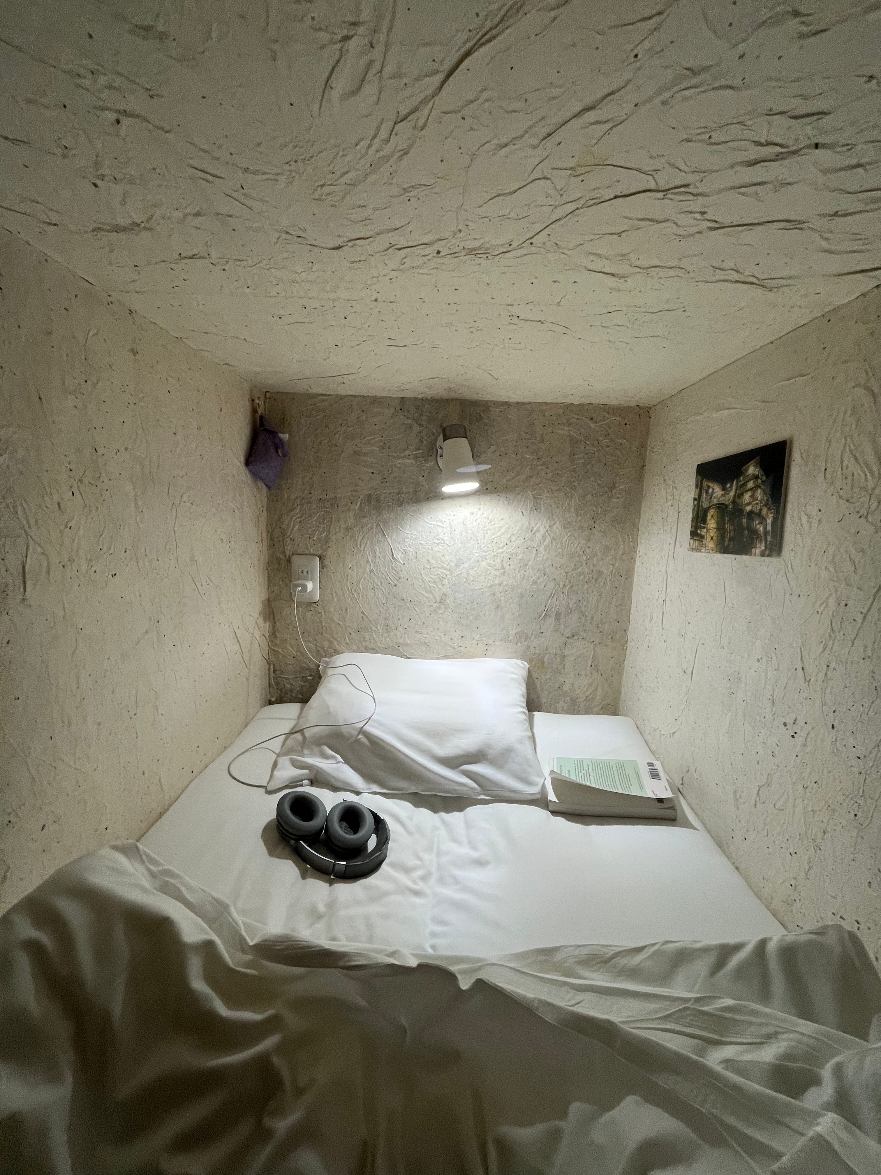 When I get back to my capsule hotel at around midnight, I finally check in. This is my first time staying in a capsule hotel, and I would describe it like a futuristic dorm. You have a little sleeping berth, kind of like last night in Hiroshima but more sleek, less like a cave. You get a locker to put your stuff in, a towel, and pajamas. The bathrooms, like a dorm, are communal, but unlike a dorm are stocked with everything you need from shampoo and conditioner to floss and razors. Though it smells faintly of cigarettes, it’s pretty nice.