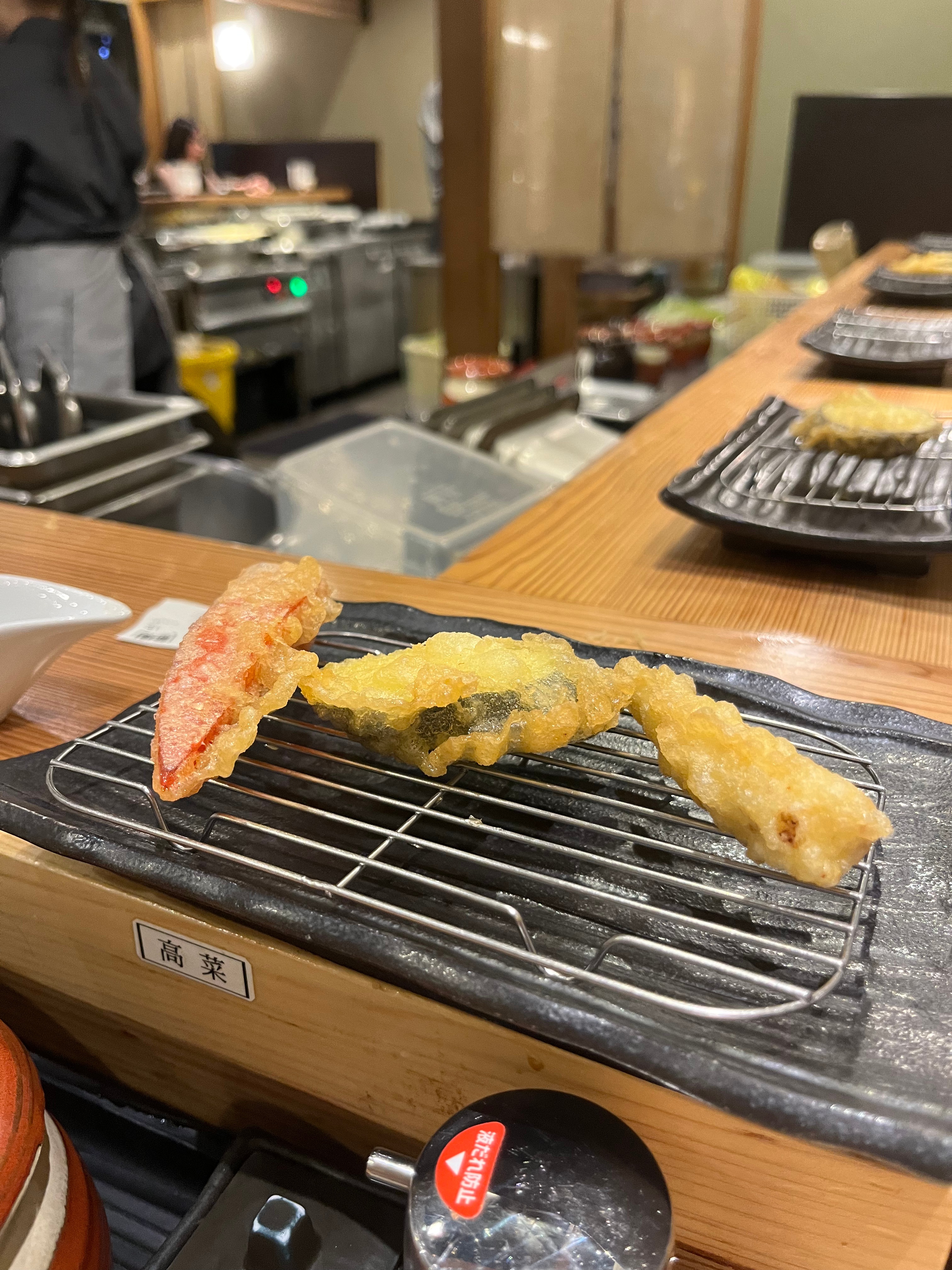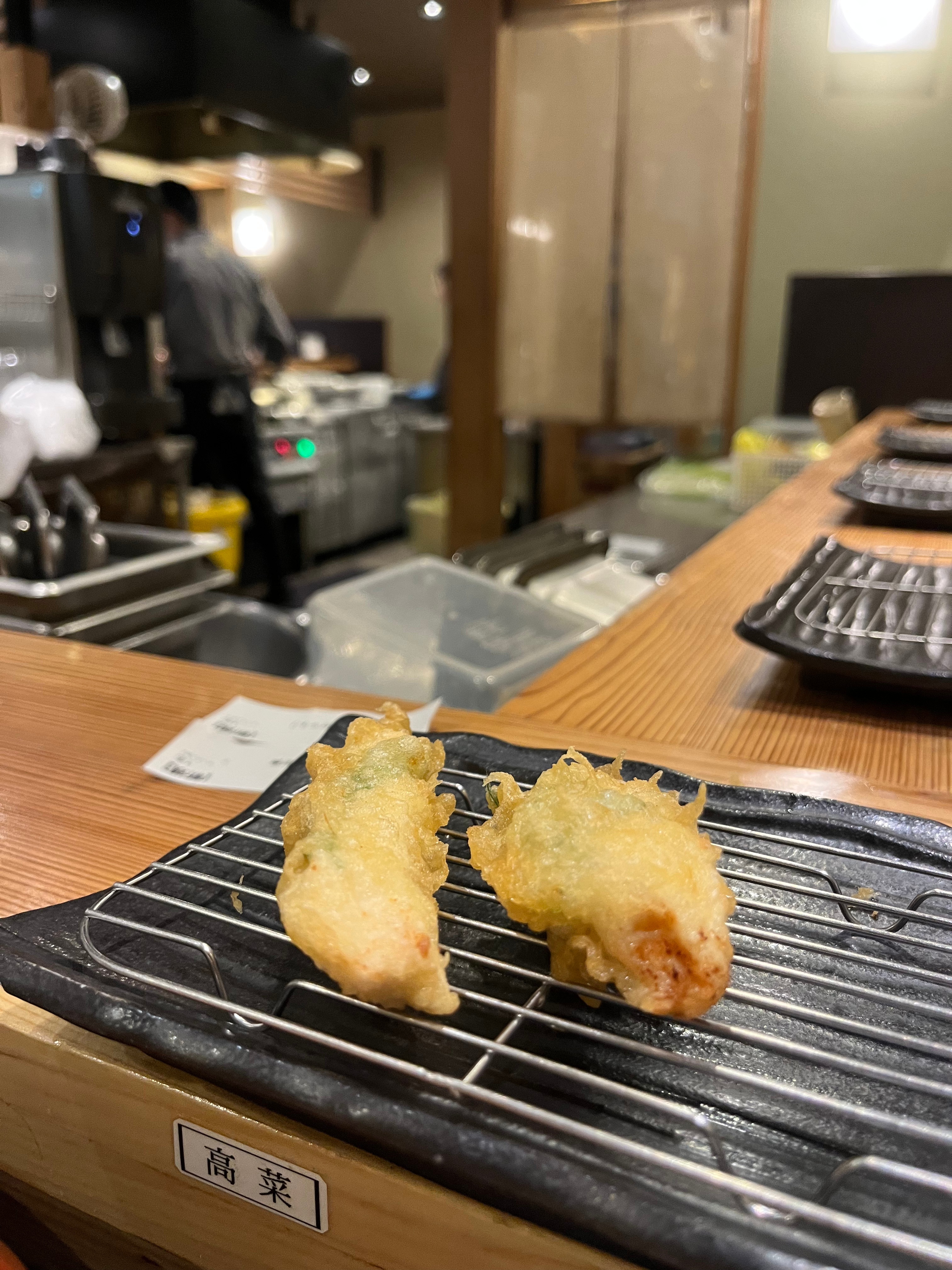 I capped off my long weekend with a sensational tempura dinner near Matsuyama City Station. I had the season summer set, which came with some white fish, shiso-wrapped chicken, bell pepper, baby corn, zucchini, renkon (lotus root), and finally this corn-fritter thing which was the best by far. I also opted for a tempura’d egg, with a runny yolk that is meant to be broken over your bowl of rice.