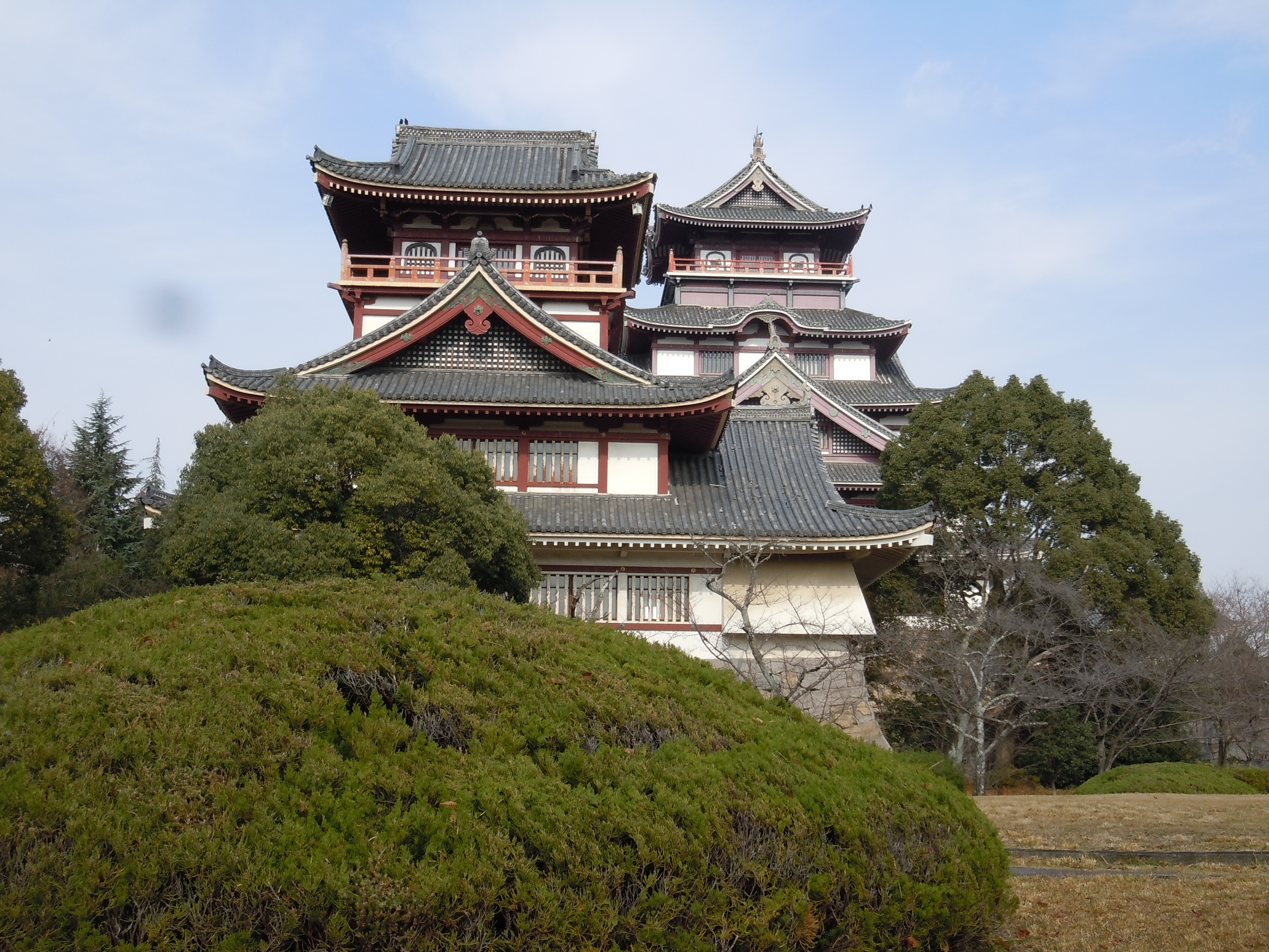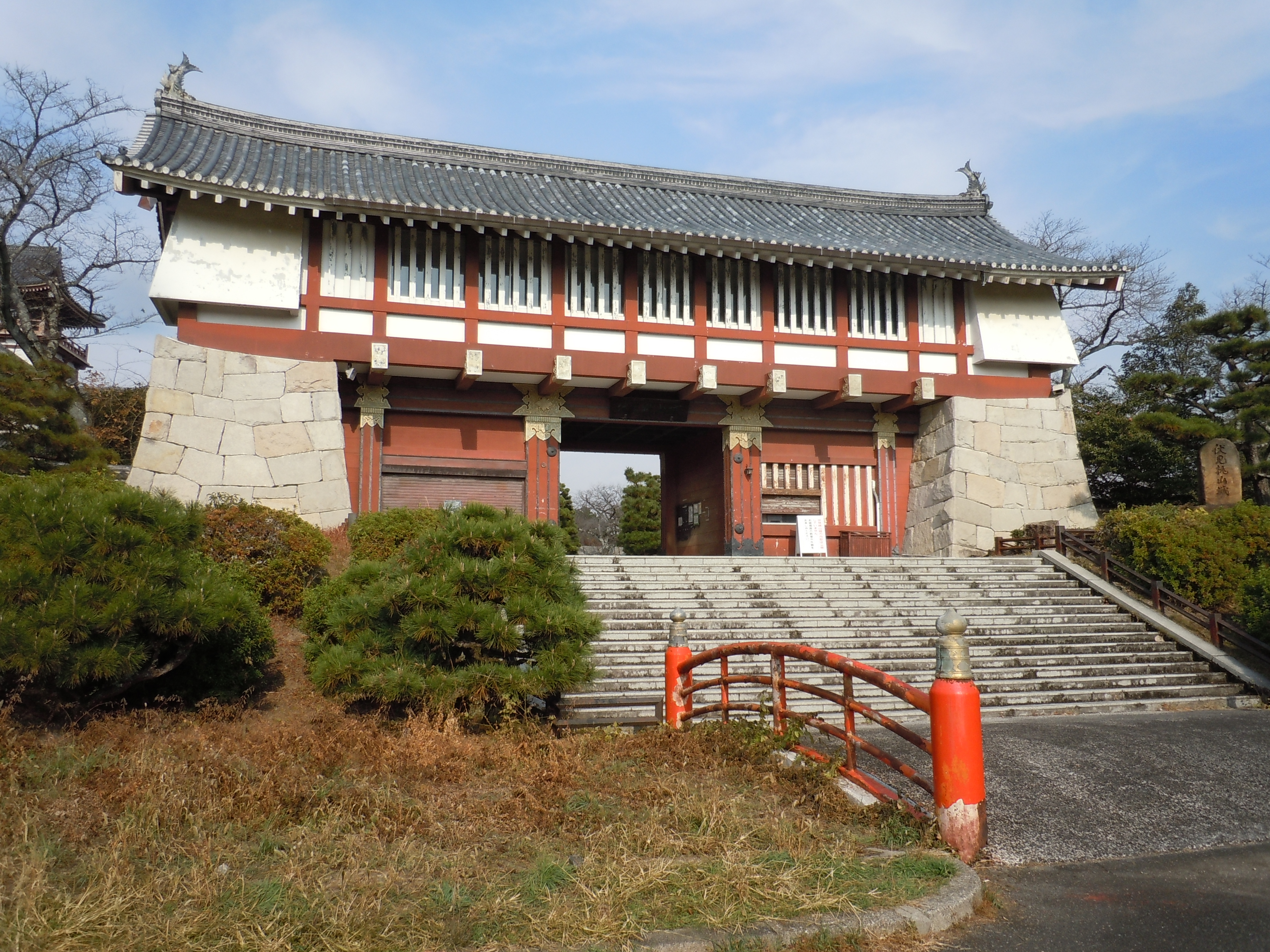 Right next door is the Fushimi-Momoyama Castle. Originally constructed in 1594 as a retirement palace for Toyotomi Hideyoshi, an important samurai and daimyo (feudal lord). Once the site of some important battles, it was dismantled in 1623 and its materials repurposed for temples and castles across Japan. The current structure is (like Kinkaku-ji) a replica, built mostly of concrete in 1964, which is somewhat disappointing. In fact, so many castles in Japan are replicas that there are only a dozen “original” castles (meaning the main keep is intact and has been standing since around the Edo Period), two of which are in Ehime Prefecture. Represent!