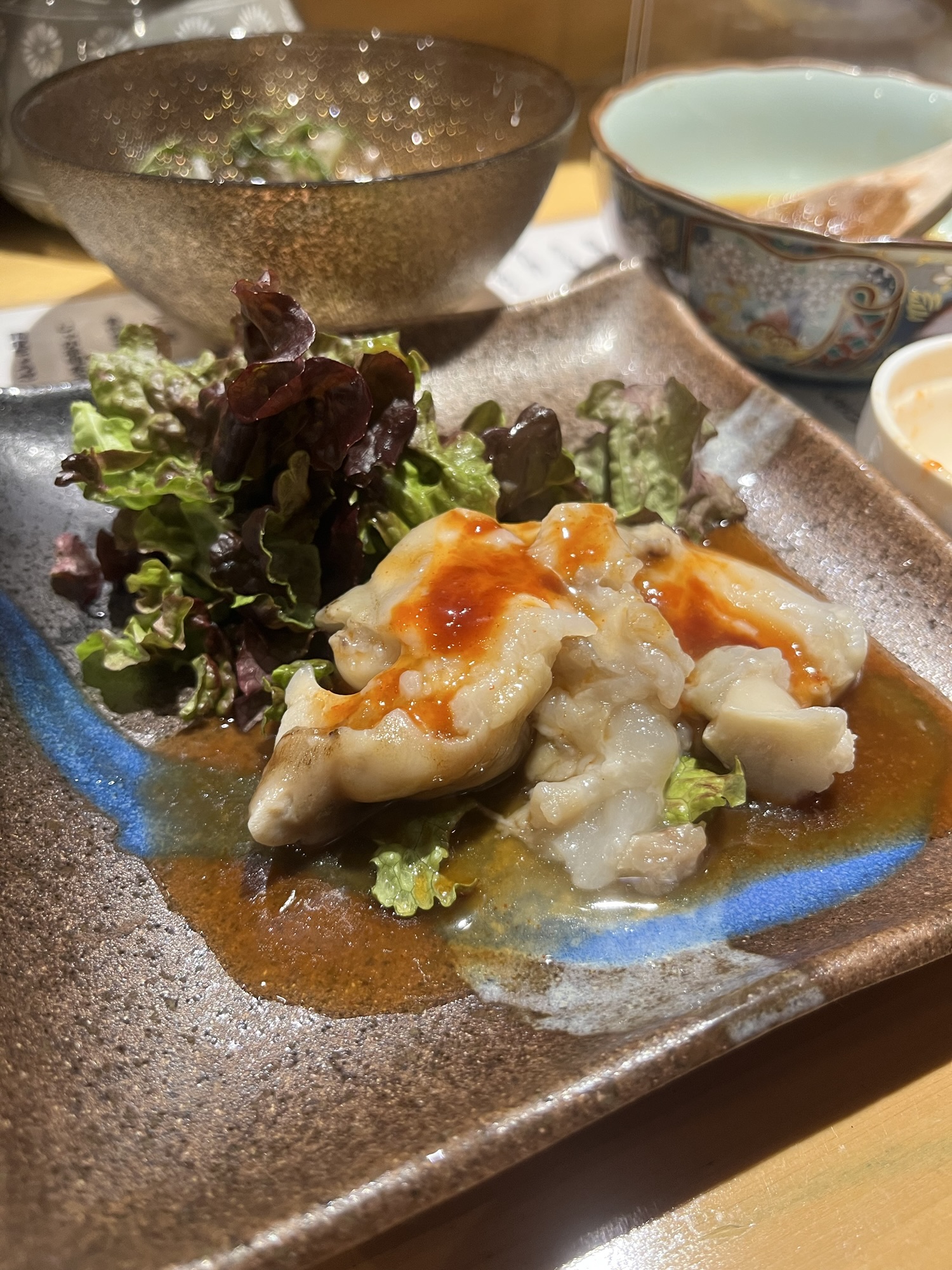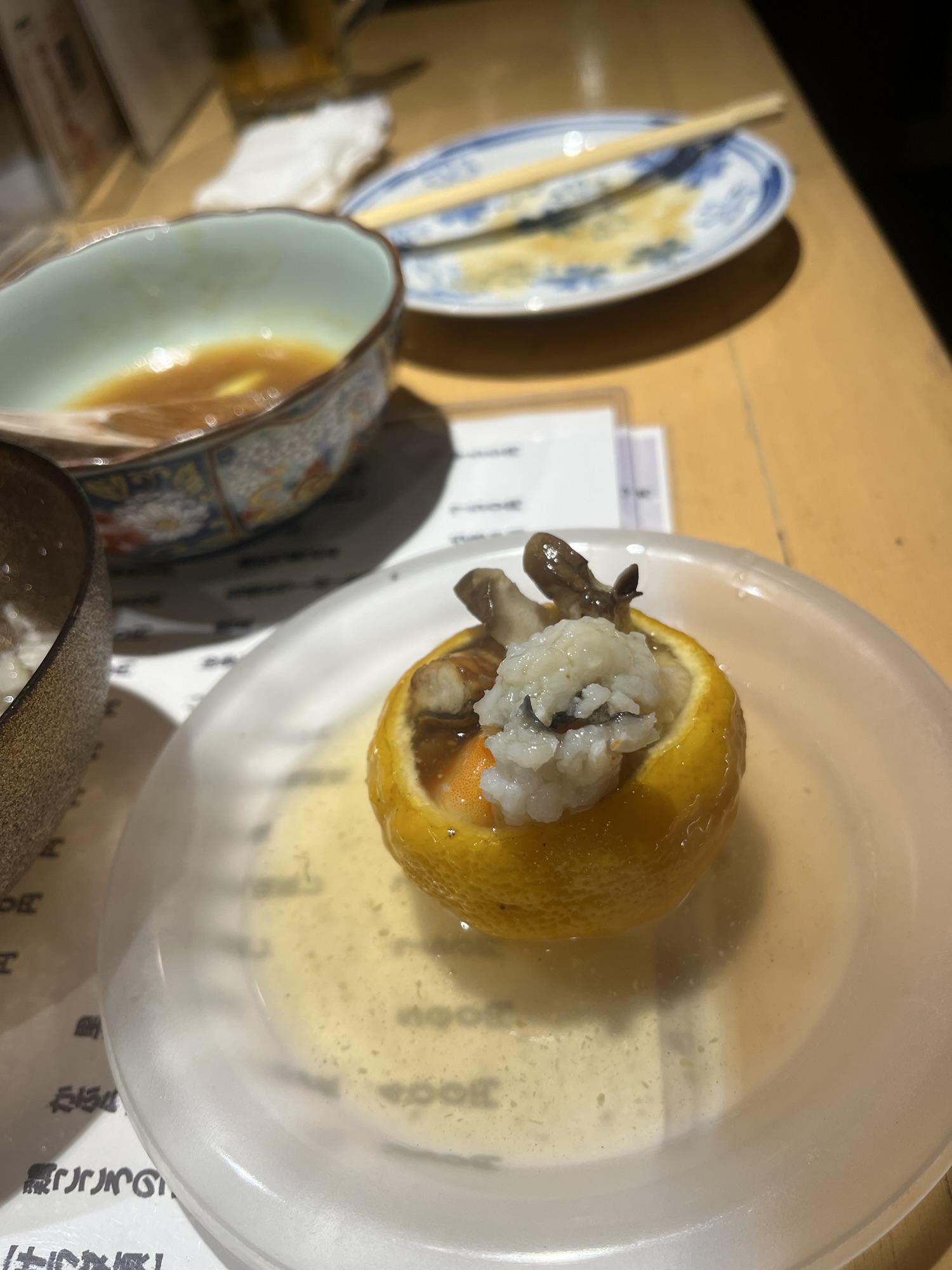 I don’t remember everything we ate, but the highlights were the sashimi and the chicken-skin gyoza (which I had the pleasure of sampling for the first time at an izakaya in Iyo). Weirder bits included boiled pig’s feet with a Tabasco-y sauce (just fat, pretty much) and some seafood served inside a yuzu peel. But it was definitely cozy vibes in a small neighborhood joint.