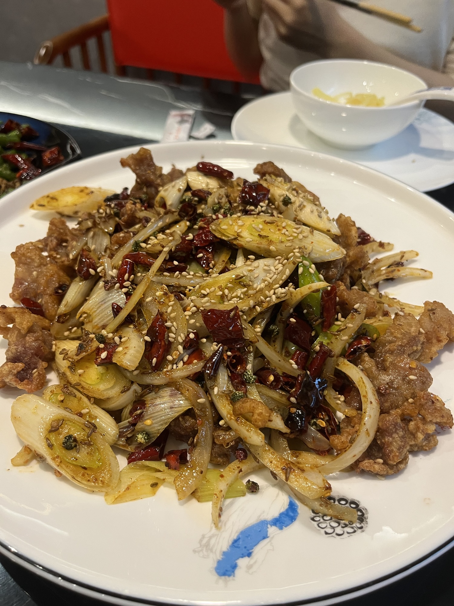 Blessed as I was to be accompanied by someone from the glorious People’s Republic of China, I insisted that we dine on authentic Sichuan fare. Bobo took me to the most random restaurant on the second floor of a filthy building behind a drug store. To exemplify this, the bathroom – which you’re going to want to locate before eating Sichuan food – had a security access code, a practice while common in the States is exceedingly rare in Japan. When we walked in, there was one middle aged Chinese dude ripping cigs at a table and seemingly no one else. Nevertheless, we sat, and Bobo ordered stir-fried green beans and shredded potatoes to accompany the centerpiece of lamb with cumin. The restaurant filled up around us, with most people ordering the famous poached fish that I had in Osaka (and saw everywhere in Singapore).
