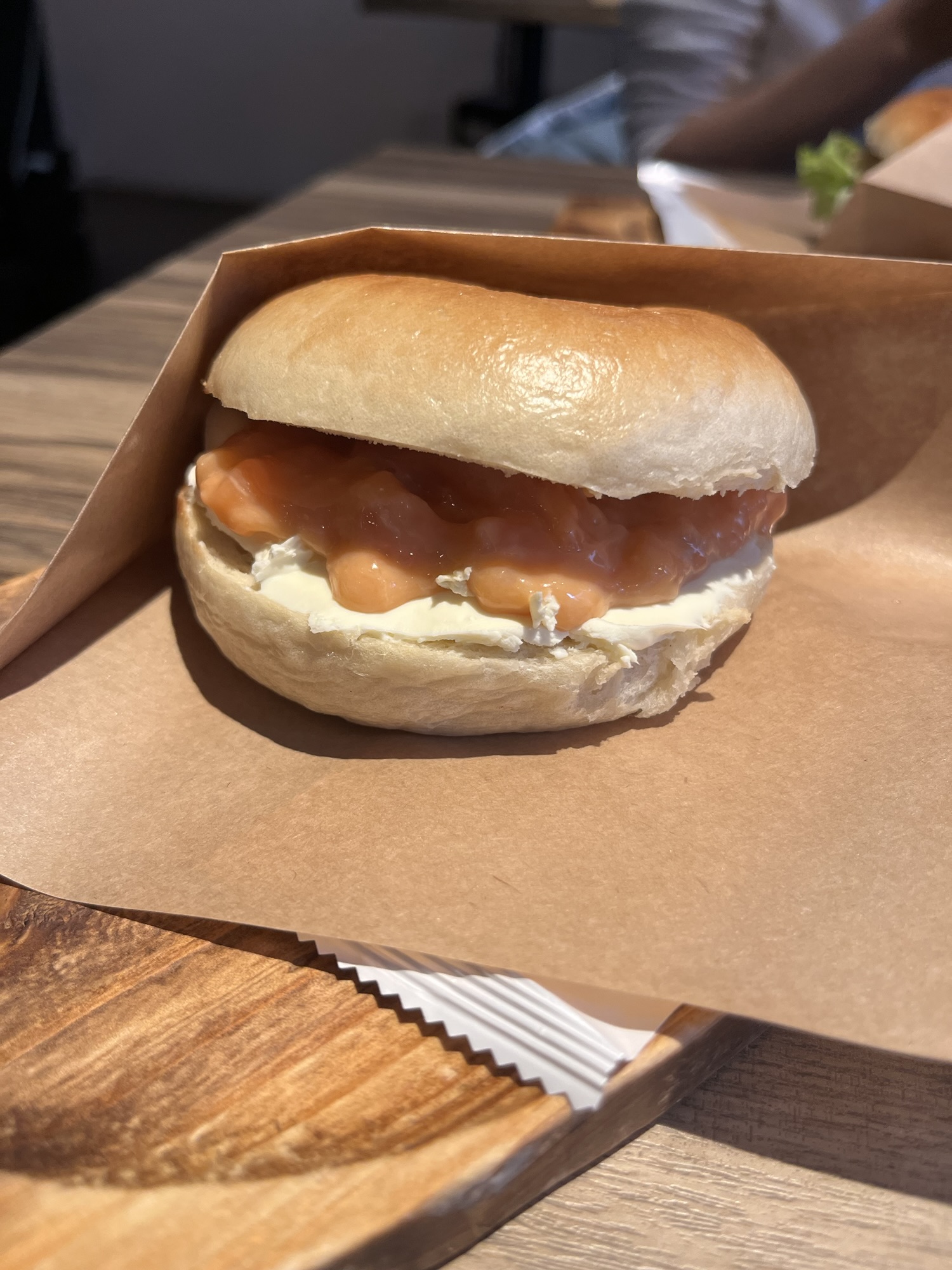 The next morning, I wanted a bagel. I was sorely disappointed by what I found, a squishy roll-with-a-hole with cream cheese, salmon, and some sort of weird ikura goop that seemed more like fishing bait than food for humans. Forgive my strong language, but this thing was fucking gross.