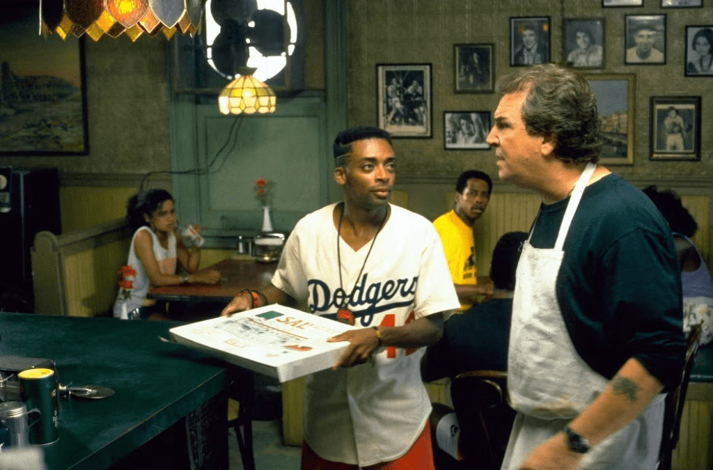 A pizza restaurant plays a prominent role in Spike Lee’s Do the Right Thing (1989). Sal’s Famous Pizzeria in Bedford-Stuyvesant is a pillar of the community, and even though most Italians and other ethnic whites have fled Bed-Stuy for deeper Brooklyn, Queens, or the suburbs long ago, Sal understands that his pizza is important to the people who live there. There’s a reason why Spike Lee chose a pizzeria as the physical crux of his movie. Everyone eats pizza; it has long since transcended any notion of being an “ethnic food” to become something that is universally recognized as American. The mozzarella is a connective tissue tying us all together. Though the movie ends in tragedy, I don’t think I’m wrong to underscore the role of pizza in it.